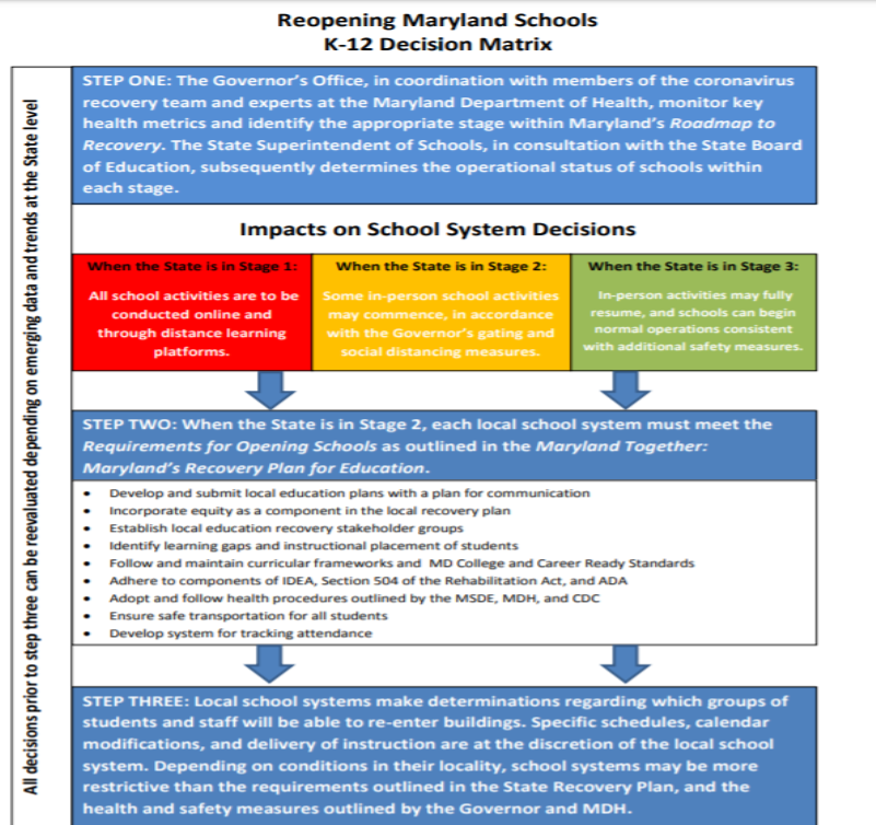 The MSDE Recovery Plan, aligned with the Governor’s Maryland Strong: Roadmap to Recovery, continues to be a fluid document, shaped by information as it becomes available and through ongoing stakeholder input and feedback. The MSDE, Division of Early Intervention and Special Education Services (DEI/SES) recognizes that serving students with disabilities requires additional considerations to comply with the Individuals with Disabilities Education Act (IDEA): including ensuring continued access to the general education curriculum, and an IEP designed/implemented to allow the student to make progress on their Individualized Education Program (IEP) goals through changing service delivery models as school re-open.